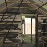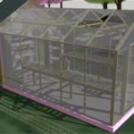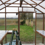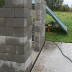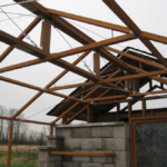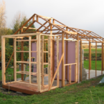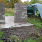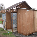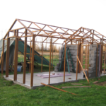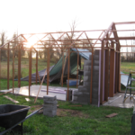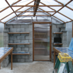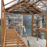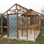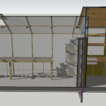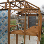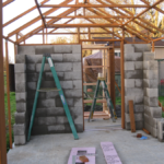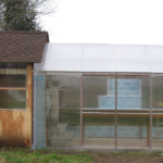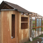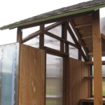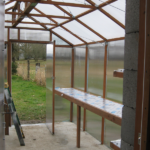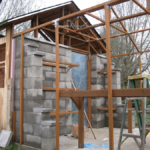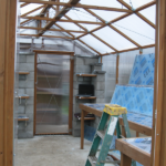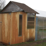 There is a small family hops farm on Sauvies Island, near the norther edge of Portland, OR. A greenhouse was commissioned for the property, and Bridgeview Painting Co. was selected to undertake design and construction. A 10ft by 20ft site had been selected, and the greenhouse was to include a covered work area with shelving, thermal mass wall, and even a utility sink. An attached shed for the storage of chicken feed and various tools was eventually included, and a spigot replaced the sink in favor of counter space. The thermal mass wall included water filled bottles placed within cinder blocks, and poured in place with concrete to improve thermal retention.